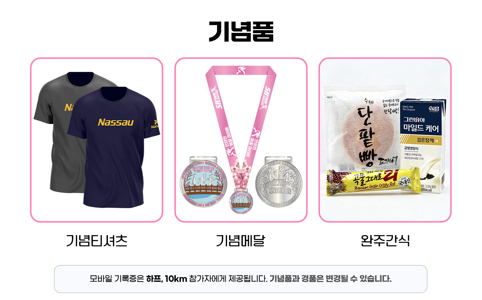 [ 기념티셔츠, 완주메달, 기록증(하프/10km), 간식(빵,음료수) ]
