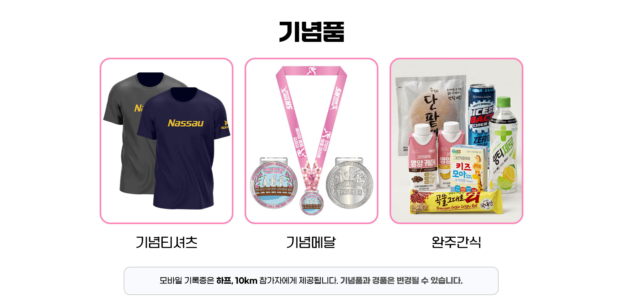 [ 기념티셔츠, 완주메달, 기록증(하프/10km), 간식(빵,음료수) ]